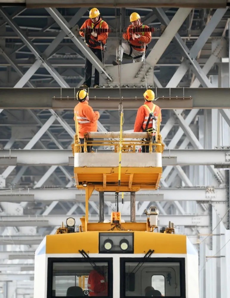 1月30日,京九铁路九江长江大桥上,责任主谈主员在诊疗战役网设置。胡国林摄(中经视觉)