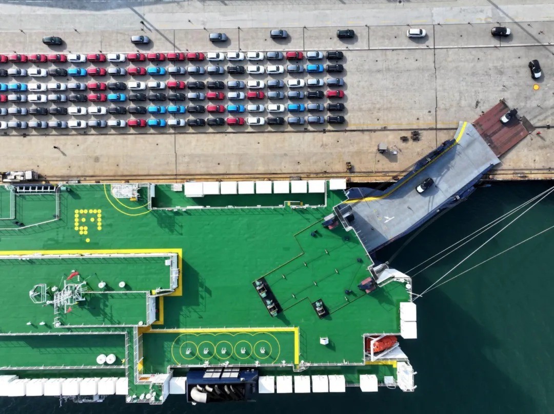 1月30日,江苏省连云港港东方港务分公司船埠,出口车辆有序装船。王春摄 (中经视觉)