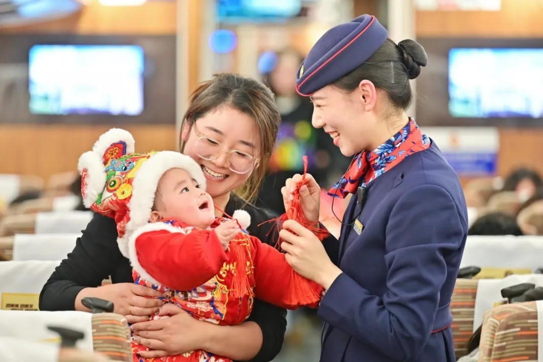 1月28日,除夕,在河南郑州东站始发的G6697次列车上,乘务东谈主员与小一又友互动。王玮摄(中经视觉)