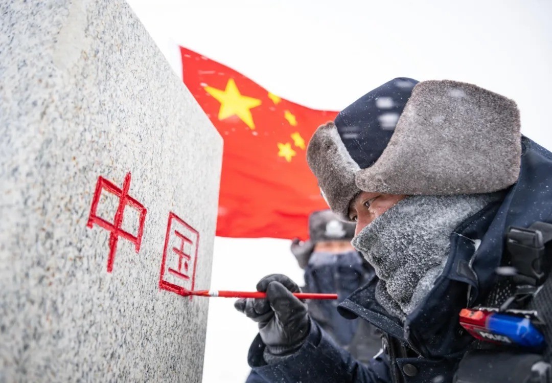 1月29日,正月月吉,新疆昌吉大黄水泉边境派出所民警在边境描红界碑。何龙摄(中经视觉)