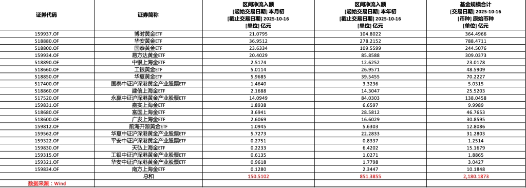 现在商场上有20只黄金主题ETF(包括14只商品型ETF和6只股票型ETF),较好的“收货效应”招引了遍及投资者涌入。Wind数据流露,摈弃10月16日,全商场20只与黄金联系的ETF共计净流入额本年以来已达851.39亿元,最新范畴更攀升至2180.19亿元。