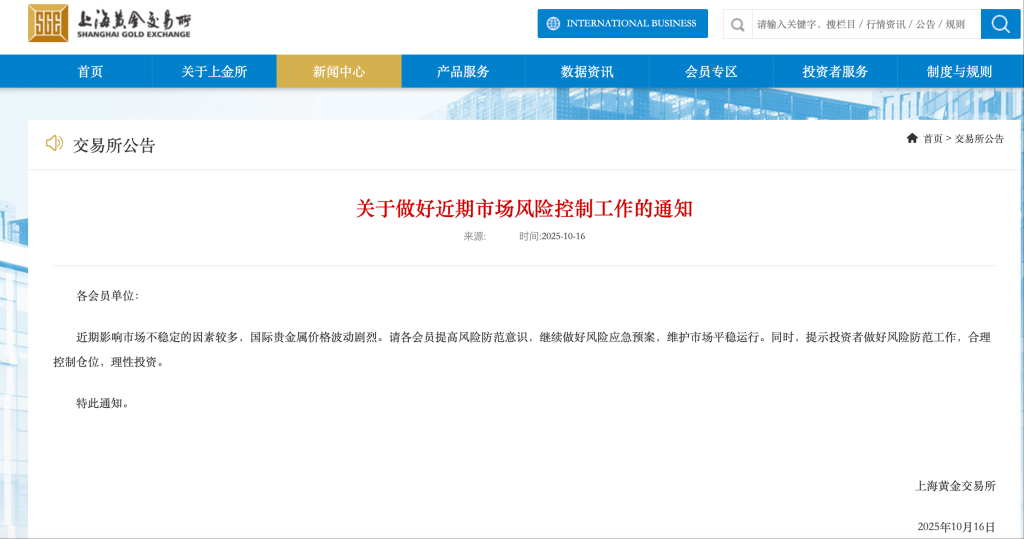 10月16日,上海黄金往来所发布《对于作念好近期商场风险限制职责的奉告》称,近期影响商场不褂讪的身分较多,国外贵金属价钱波动剧烈。同期,辅导投资者作念好风险防备职责,合理限制仓位,感性投资。