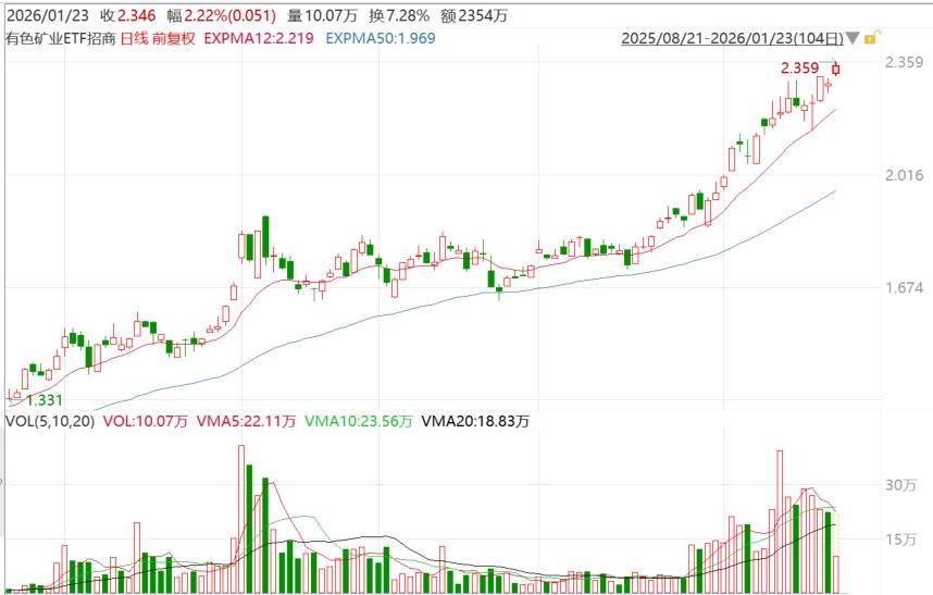 1月23日,贵金属延续大涨,白银有色四连板,湖南白银涨超8%,驰宏锌锗、赤峰黄金、兴业银锡、中金岭南、西部黄金等涨超5%。有色矿业ETF招商(159690)涨2.22%kaiyun体育登录网页入口,盘中赓续刷新上市以来新高,该ETF相接9日获资金净流入1.43亿元。