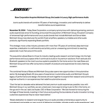 这次收购完成后,Bose、McIntosh 和 Sonus faber 将不竭孤独运营,保执各自品牌特点和居品线。